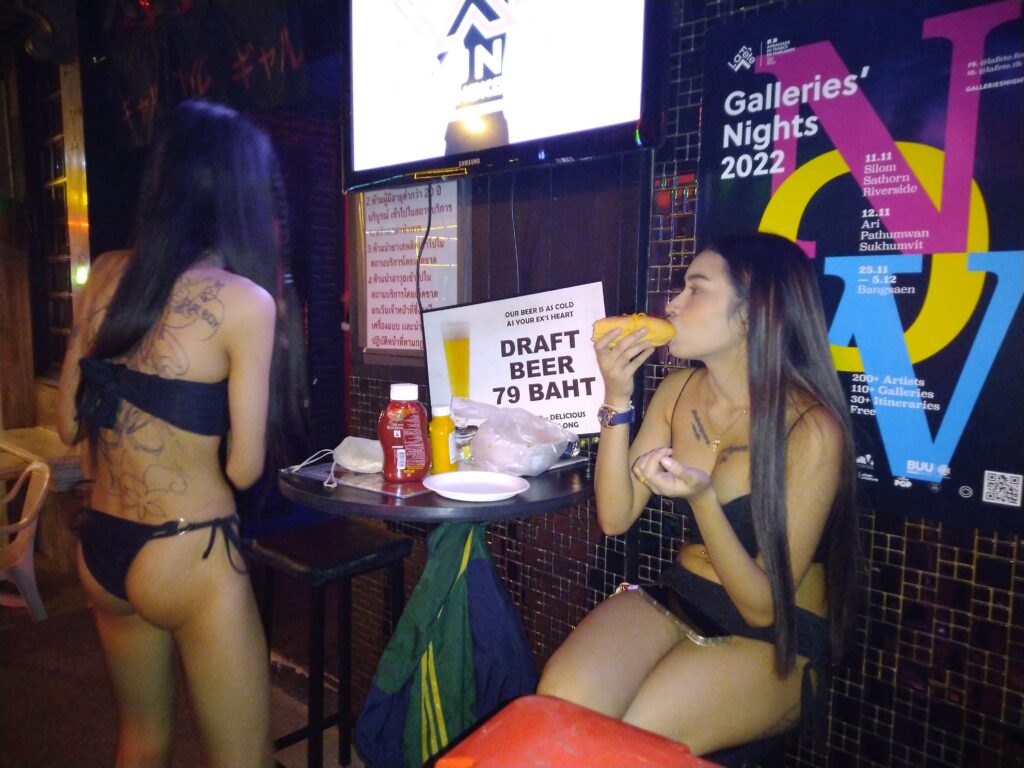 Saturday wasn’t as busy on account of it not being Gallery Night, but nearly every gogo was full up by 9 pm. Pink Panther is now fully stocked with 30 dancers, including a new clique of hotsters who all know each other and who move through the gogo like the Pink Ladies in “Grease.” They’re hot and they know it. Young, pouting, tattooed sex-wunderkinder. Baifern, who got her start in the Panther 6 years ago and quickly relocated to Soi Thaniya is back at PP. I barfined Baifern (“Baifined” for short) back in 2017 and she even modeled for some of my artwork. Several renderings of her back tattoo currently hang in XXX Lounge (now through Nov 17). Speakiing of XXX, Bpai left her phone in the bar’s toilet last week and some asshole customer stole it. And yet, she had a new phone yesterday. I’ve no idea how these girls, who live tip-to-tip and day-to-day pull off large purchases like that. Maybe she scored a short-timer. Earn sported a new tattoo on Friday—an outline that covers both ass cheeks. No wonder she won’t stop bugging me to come to my room. She needs cash to fill in the color.