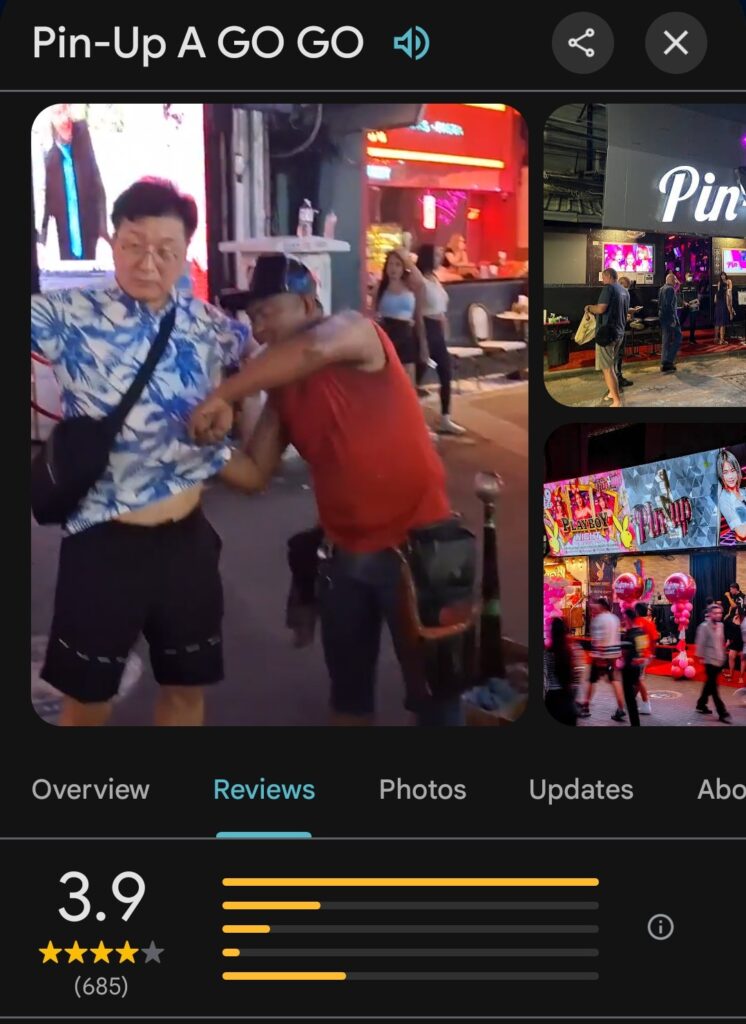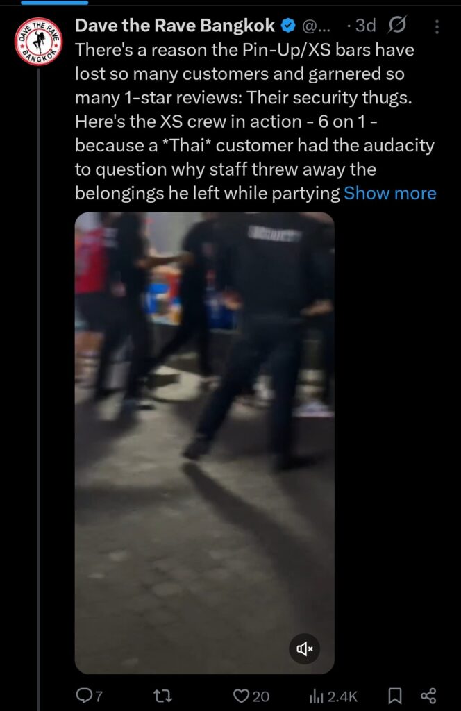In retard news, Bob James—aka Bob the Knob, aka Dave the Rave, aka the biggest pile of shit in all of Thailand posted a video on DtR’s X account of security guards outside Pin-Up beating the shit out of a Thai guy. Above it, he wrote “There’s a reason why Pin-up/XS bars have so many 1-star reviews.” Of the skirmish, he said “a Thai customer had the audacity to question why staff threw away the belongings he left while partying.” But I spoke with one of the bosses and he said the guards who got in the fight were not from Pin-Up, but rather had chased the dude out of a different bar (I won’t say the name). He said any security guards working for their bars who openly fight on Walking Street would be instantly fired. But Bob hates Pin-Up and XS because they refused to hire him for photos and PR, so he slags them off every chance he gets, and blatantly lies about all other bars that won’t hire him in an effort to hurt their business. If that sounds childish to you, it’s because it is. Bob has the mentality of a five-year-old with Down’s Syndrome.