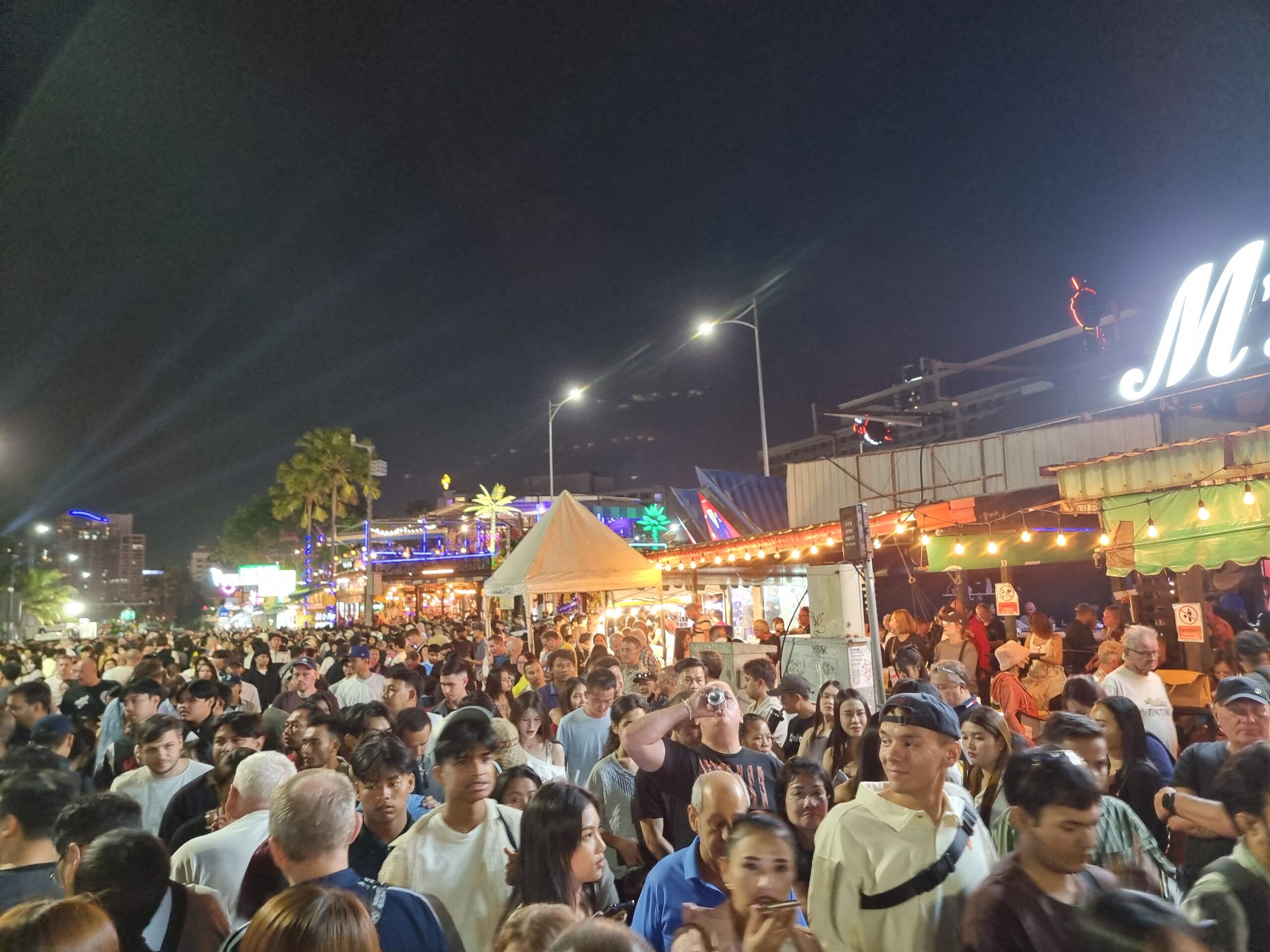 By 14.30 people were already staking spots on the beach to watch the fireworks. Not dozens but hundreds of cops and military made for a formidable sight. By 18.00 the br was closed and rammed with people. It felt like all of Chonburi province was in town. Temples and schools became car parks. At the ws end the cops set up a single metal detector for thousands of people. They gave up on using it almost immediately. It seemed silly, since none of the side streets leading from the 2nd Road had one.