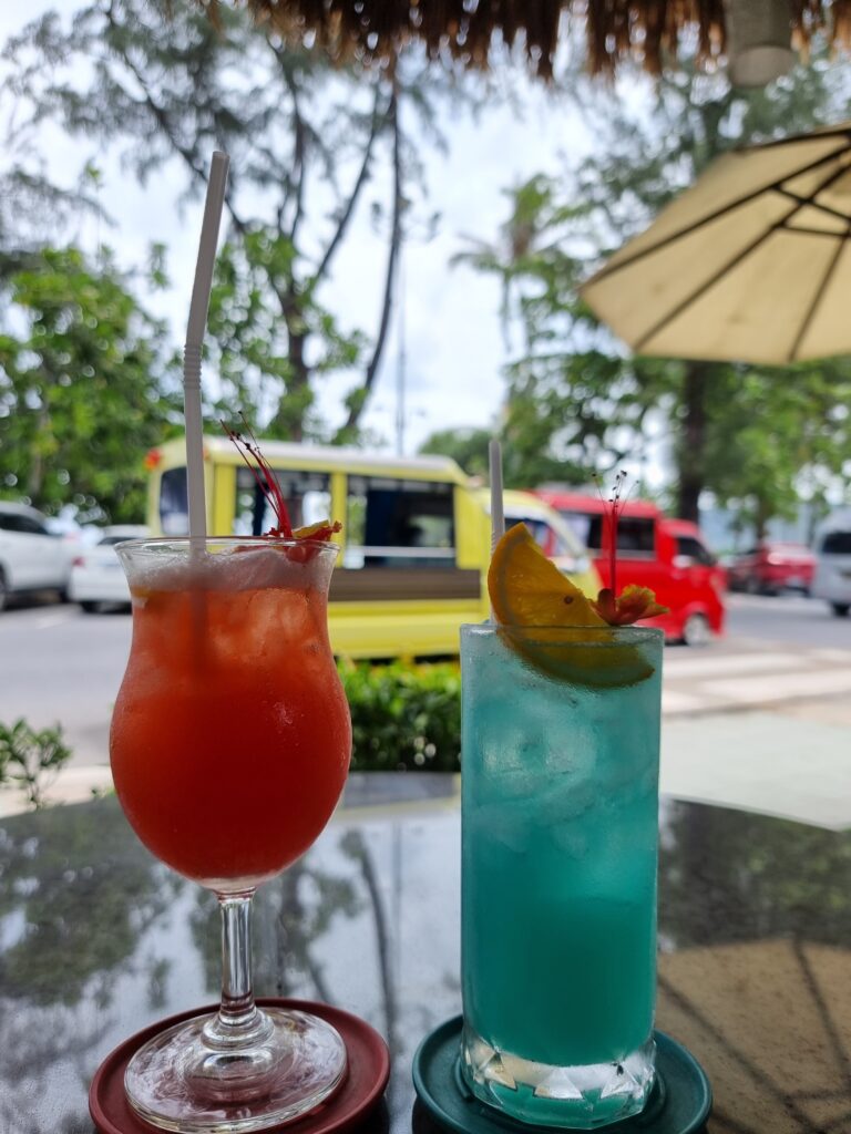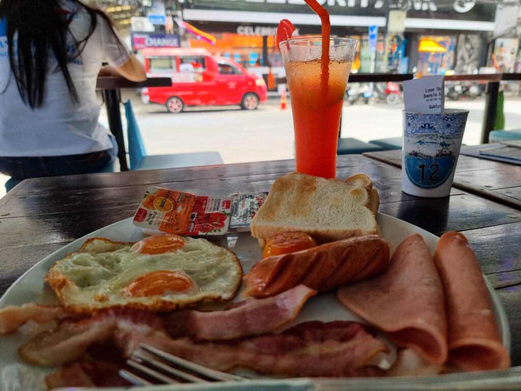 The old familiar drive t’Patong brought back a flood of memories. The lush green jungle pushes in from all sides. One glance and I clicked back into Southern Mode. Time slowed down. All negative thoughts seemed to seep from my pores and drain away. I was too early to check in so I took a walk and was sunburnt in under 5 minutes. Patong in the morning is just young Chinese tourists, most of them hot females, taking selfies. The area has changed a lot, notably on Bangla Road as well as a Central across from Jungceylon with an awesome Tops food court. I found a bar across from soi sea dragon that sold a humble breakfast and so I ordered one with a tequila sunrise. The barmaid said, really? It have alcohol, you OK? In my former Phuket days it wasn’t uncommon to have beer instead of coffee in the mornings. Maybe the place is going soft. 400b for the cocktail and food.