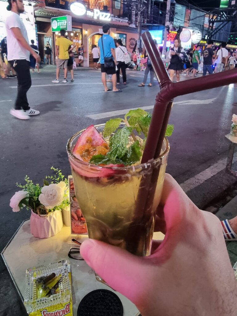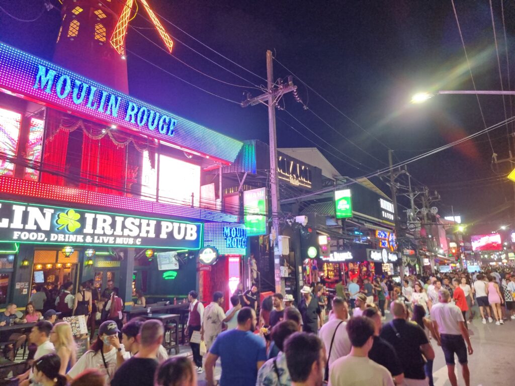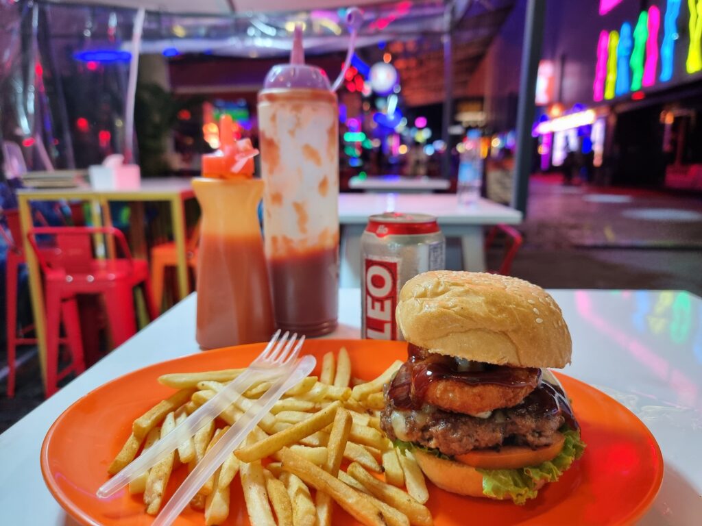That afternoon, the sky opened up and drenched Phuket in a deluge. By 20.00 though, it’d dried, so I hit Bangla again, hoping for better luck in the hot girl category. I had a BBQ burger at Alien Taco, then zigzagged around the gogo barkers who all said, “You come back again?” but my plan was to find a perch somewhere on Bangla and just people watch.