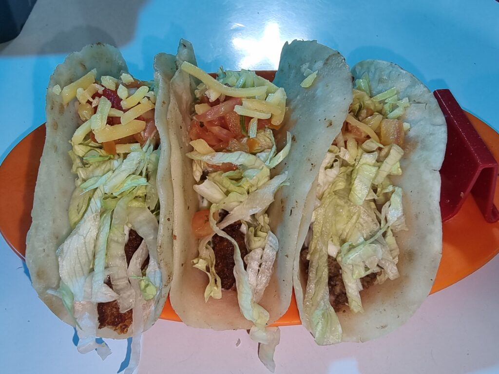I got an Aussie beef taco and 2 fish tacos for 200b. They were small but good. The only misstep was the Thai cook putting the same toppings on all 3 tacos. Fish tacos should have cabbage, lime, and crema, not lettuce and cheese. But they were still quite tasty.