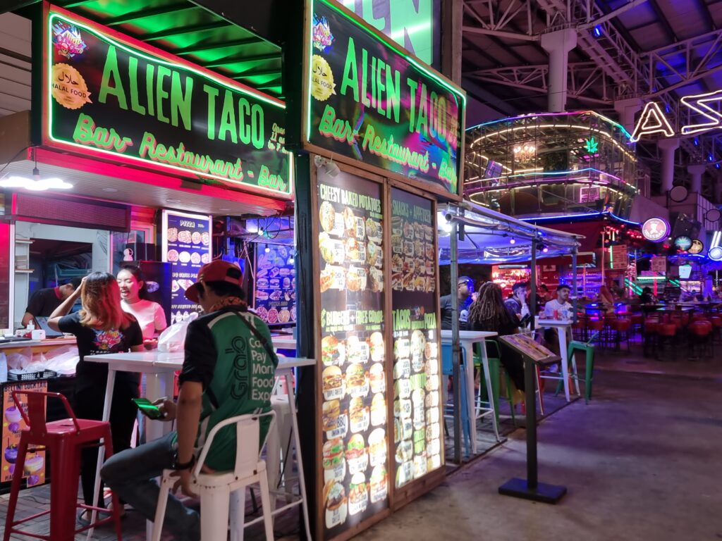 I stayed at the Days Inn, for 3 reasons: 1–Agoda gave them a high rating, 2–it’s 60 meters from Bangla Road and 3–as a yank, it’s a familiar brand. The room was nice enough. Good aircon. Plus they had a fitness center and a rooftop pool. Wifi took a few failed attempts and my first key card didn’t work, but things smoothed out after that. I napped until 19.00 and then struck out, too early for anything fun, of course, and found a little eatery at the end of soi sea dragon called Alien Taco. But the name is misleading. First, the only alien in there was me. Second, tacos were just the tip of the menu iceberg. They had burgers, burritos, hot dogs, pizza, buffalo wings, gyoza, spring rolls, calamari, fish and chips, steak frites, chicken and waffles, Philly cheesesteak, doner kebabs, nachos, and chicken parmigiana. I mean, why bother supping anywhere else?