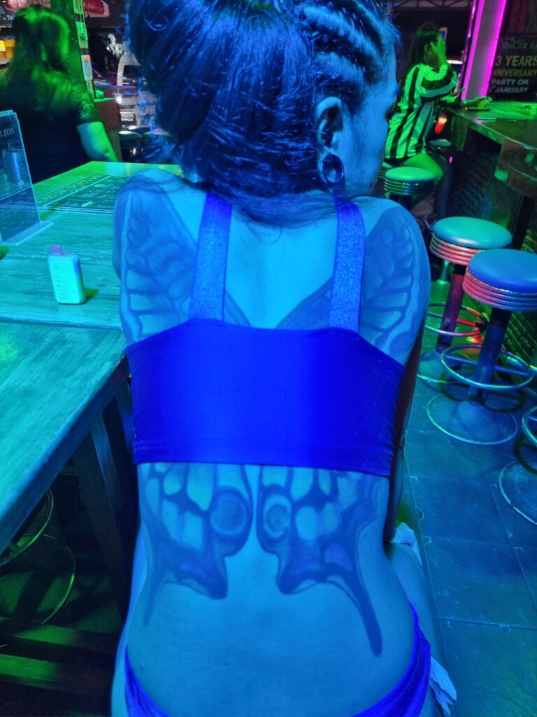 I’ll say this for Bangla: with the exception of maybe The Pizza Company, which always appears empty, the bars and eateries are making money hand over fist. It’s like Patpong, Nana, Soi 4, and Soi 11 all combined into one tourist catch-all. At 19.55, the gogo dancers started showing up for work, and the soi was awash in young clunge like a human rainbow of poontang. After too many cocktails, I tried to go home, but as I passed Oscar Sport Bar, I noticed a particularly talented pole dancer performing for no one and stopped in to tip her a hundy, and that’s when the craziest thing happened. I put the money in her bra and went to the bar for one more drink, and was surprised to find the dancer had followed me. She asked to sit down and I said yes. Then I asked her name. “Jeda,” she replied, and my brain went DING! Because I remembered a girl named Jeda who used to pole dance on Soi Sea Dragon 12 years ago. We were casual friends back then. I probably saw her two or three times. She had a massive butterfly tattoo on her back, so I said, “Jeda! You have a butterfly tattoo on your…” and she turned to show me the shoulder-to-shoulder butterfly on her back, her eyes wide with surprise. I said, “You’re not going to remember, but you let me take a photo of your tattoo 12 years ago. My name is—” “Seven!” she shouted, and started bouncing up and down in her seat. We spent the next hour catching up, joking and laughing, and for a moment it felt like the Phuket I remembered. Then the mamasan brought me a long island iced tea and the next thing I knew, I woke up in my hotel room.