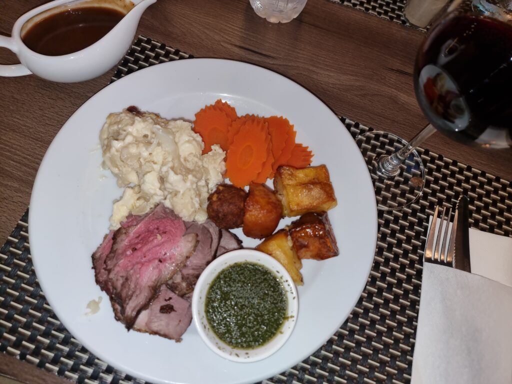 The gravy also gets a 10/10. One great culinary talent the Brits possess is making gravy. The “stuffing” appeared on the plate as a tiny, hard, round foosball. Now, full disclosure, American stuffing looks and tastes nothing like all other stuffing. American stuffing is a warm, moist pile of savory goodness, not unlike mashed potatoes in appearance and consistency. I’ve tried Irish stuffing, English stuffing, and probably a handful of other things chefs have called ‘stuffing,’ but none of it comes close to the yankee version.