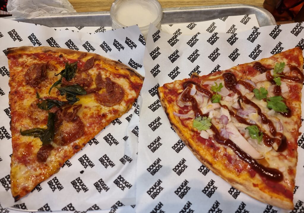 Last Sunday, I got a wild butthair and scampered over to soi Cowboy, stopping first at Dough Bros, the newish sourdough pizza joint next to the MRT exit. I got a slice of pepperoni and a slice of BBQ chicken. There was a twinge of guilt at missing Capone’s, but as they say, variety is the spice of life. The ride over was easy as the roads were more or less deserted, at least compared to typical rush hour traffic. My Bolt driver was slightly suicidal but that’s to be expected. I’ll say this for Dough Bros, they weren’t quick. But when my slices appeared, they were gigantic. The pepperoni had crispy pepperoni bits in addition to the regular, plus honey-chili oil and basil on top. The chicken had onions, cilantro, and BBQ sauce. Both came with a side of ranch. Not bad for 150b each. They even had a bottle of Frank’s Hot Sauce on the table. The crispy pepperoni bits were a tad much for my liking, but the BBQ chick tasted exactly like the one from California Pizza Kitchen back home. I have to say, I found the pizza to be a bit over the top. There was too much going on. When I have a pie, I want it to be simple and straightforward. “Too much of a good thing” is a real thing.