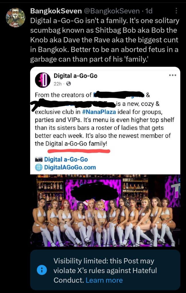 In other news, last week I was minding my own business, scrolling through Facebook on my phone, and a post from the worst person in Bangkok—Shitbag Bob aka Bob the Knob aka the fake Dave the Rave aka the lumpy sack of circumcised foreskins—came up on my feed. In it he touted the opening of one of his employers’ new bars in Nana Plaza—Tip Top or something like that—and since he’d been hired by default to do their photos, he said “welcome to the Digital a-Gogo family (that’s the name of his retarded sub-average PR business).” And yes, it’s pathetic that Bob is so unloved that the closest thing he has to family are the people he works for, and I probably shouldn’t make fun of him for it. But I have no empathy for someone so lowdown, so bereft of humanity, so stupid, so cruel to others, so self-absorbed and self-serving that he is despised by everyone who knows him, and so I posted about it on X. And Bob did what he always does when I roast him. He tattled, reporting me for hateful conduct, which is wrong for two reasons. First, X’s policy on hate covers “promoting violence or threats based on race, national origin, sexual orientation, gender, religious affiliation, age, disability, or serious disease.” I mentioned none of those things. My assertion was and is that Bob’s a cunt, which isn’t even an opinion. It’s objectively true. Second, I don’t hate Bob. Unless one of his shitty photos or brain-dead comments appears in my FB feed, I forget he exists. That’s not hate. Besides, you don’t hate the dog for shitting on the rug. But you do rub his nose in it, and I’m going to rub Bob’s nose in his own scummy behavior every time it’s put in front of me, especially when he pretends that he, by himself, taking mediocre gogo photos constitutes a ‘family.’ Fucking pathetic. He’s a low-IQ, childish asshole with a god complex and a Napoleon complex at the same time, and I’m going to eat his lunch until the day he dies.