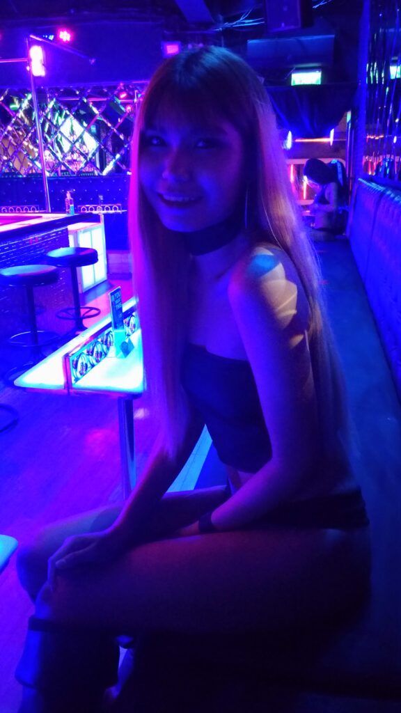 As far as I know, Ya’s gogo experience began at XXX Lounge in 2019. Before then, she was a civilian. She endured the Covid years and all the shutdowns, and was still at XXX when the cops closed it for good in March of 2023. From there, she moved to Whiskey’N’Gogo in NanaP, and stayed when it changed to Essence. But she wasn’t happy with the change of ownership and so disappeared for a while. I was shocked to bump into her (literally) outside Shark Bar on Soi Cowboy where she wore a white dress and worked as a hostess—not a dancer—probably because her boyfriend doesn’t let her barfine.